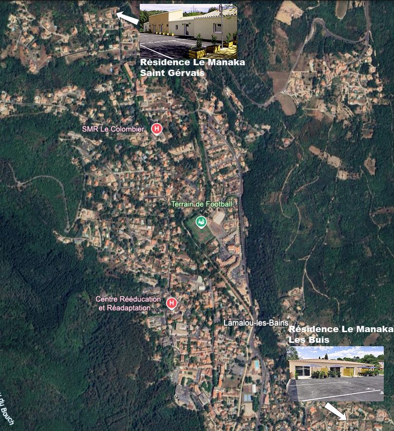 Les Résidences Le Manaka vous proposent des appartements dans un cadre calme et reposant tout en étant à proximité du centre-ville de Lamalou-les-Bains: 15 mn à pieds, 3 mn en voiture et 7 mn en Vélo.